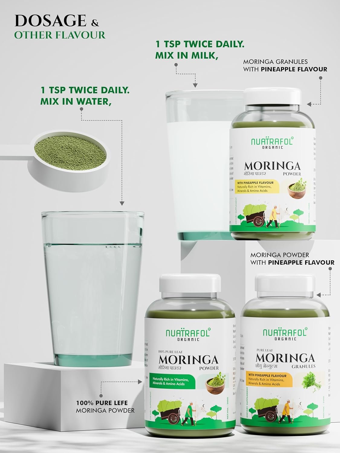 NUATRAFOL ORGANIC India’s First Flavour Based Moringa Powder. NUATRAFOL ORGANIC Pineapple Flavour Based Moringa Powder Transform your health with the power of nature! Our 100% Pure Moringa Leaf Powder is an all-natural, organic superfood packed with essential nutrients to help you thrive. Moringa, often called the “Miracle Tree,” is known for its incredible health benefits, including boosting energy, enhancing immunity, and supporting healthy digestion. This fine, green powder is made from the freshest, organically grown moringa leaves, without any additives, preservatives, or fillers. Whether you’re looking to improve your wellness, detoxify your body, or simply add a nutrient boost to your meals, this versatile powder is the perfect choice.